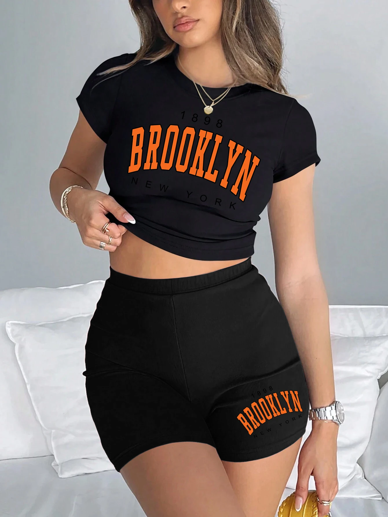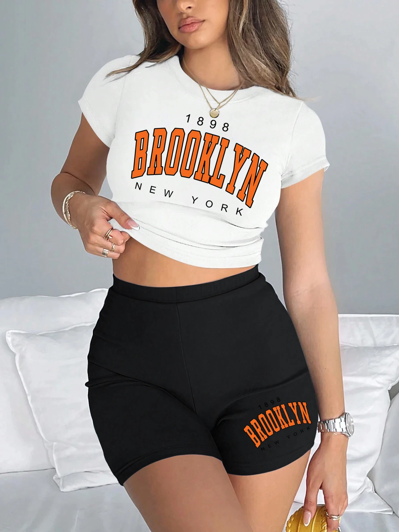 Introducing the perfect summer outfit: the 1898 Brooklyn Letter Print Two-Piece Set. This trendy ensemble features a slim-fit crop top and comfortable shorts, ideal for warm weather and casual occasions. Crafted from soft, knitted synthetic fiber, this set offers both style and comfort without harmful chemicals.